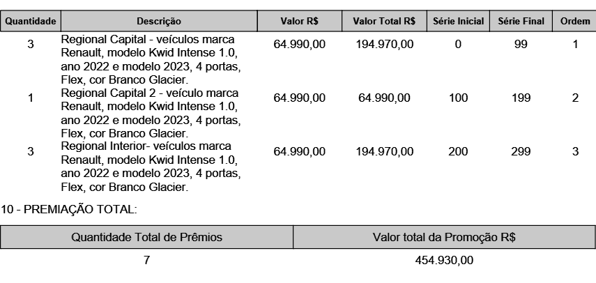 Serão oferecidos como prêmio, 7 (sete) veículos marca Renault, modelo Kwid Intense 1.0, ano 2022 e modelo 2023, 4 portas, Flex, cor Branco Glacier, valor unitário de R$ 64.990,00 (Sessenta e quatro mil novecentos e noventa reais).