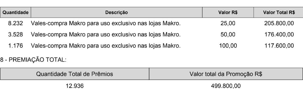 A cada R$ 200,00 (duzentos reais) em compras nas lojas físicas do Makro, desde que atendidas as premissas de participação aqui descritas, o participante receberá 1 (um) Número da Sorte, para concorrer ao prêmio desta promoção, de acordo com a origem da sua compra, conforme Quadro abaixo:
